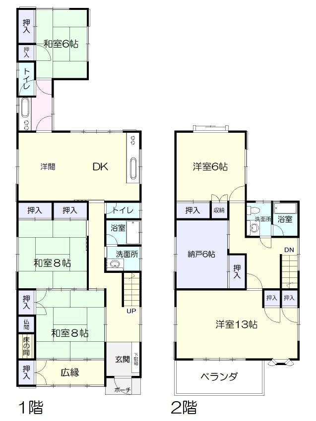駐車場4台(2台縦列)、トイレ3ヶ所(1F2ヶ所・2F1ヶ所)、出窓、ベランダ、納戸、浴室2ヶ所、南面道路、公営水道、個別浄化槽、プロパンガス