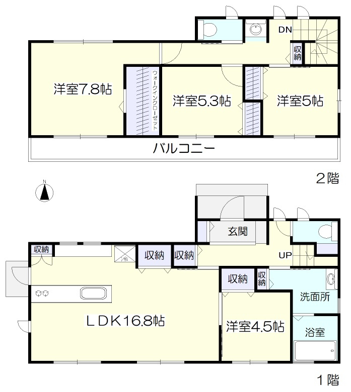 備考:駐車場並列4台可、対面キッチン、1坪風呂、トイレ2ヵ所、2階洗面化粧台、ウォークインクローゼット、南面3室、全居室洋室、外部水栓、シューズクローク、独立洗面台、浴室窓、勝手口、バルコニー、物干し金物、庭